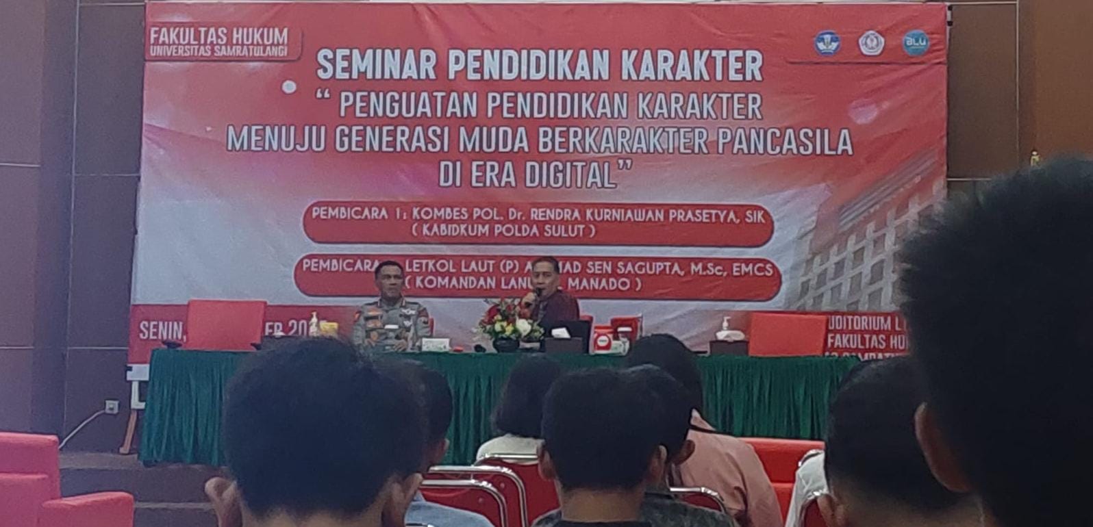 Manado, Merdeka17.id – Fakultas Hukum Universitas Sam Ratulangi menggelar Seminar Pendidikan Karakter yang bertajuk “Penguatan Pendidikan Karakter Menuju Generasi Muda Berkarakter Pancasila di Era Digital” di Lantai 12, ruang Auditorium fakultas tersebut pada Senin, 27 Oktober 2025 pagi.