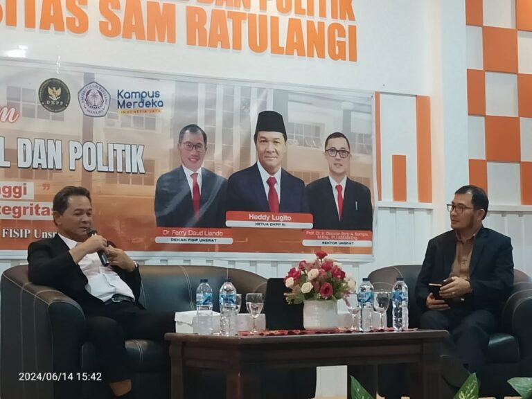 Merdeka17.id – FISIP Unsrat Manado, Dewan Kehormatan Penyelenggaraan Pemilihan Umum Republik Indonesia (DKPP RI), dan Badan Pengawas Pemilihan Umum (Bawaslu) Provinsi Sulawesi Utara melakukan kuliah bersama pada Jumat, 14 Juni 2024 di Aula FISIP Unsrat.