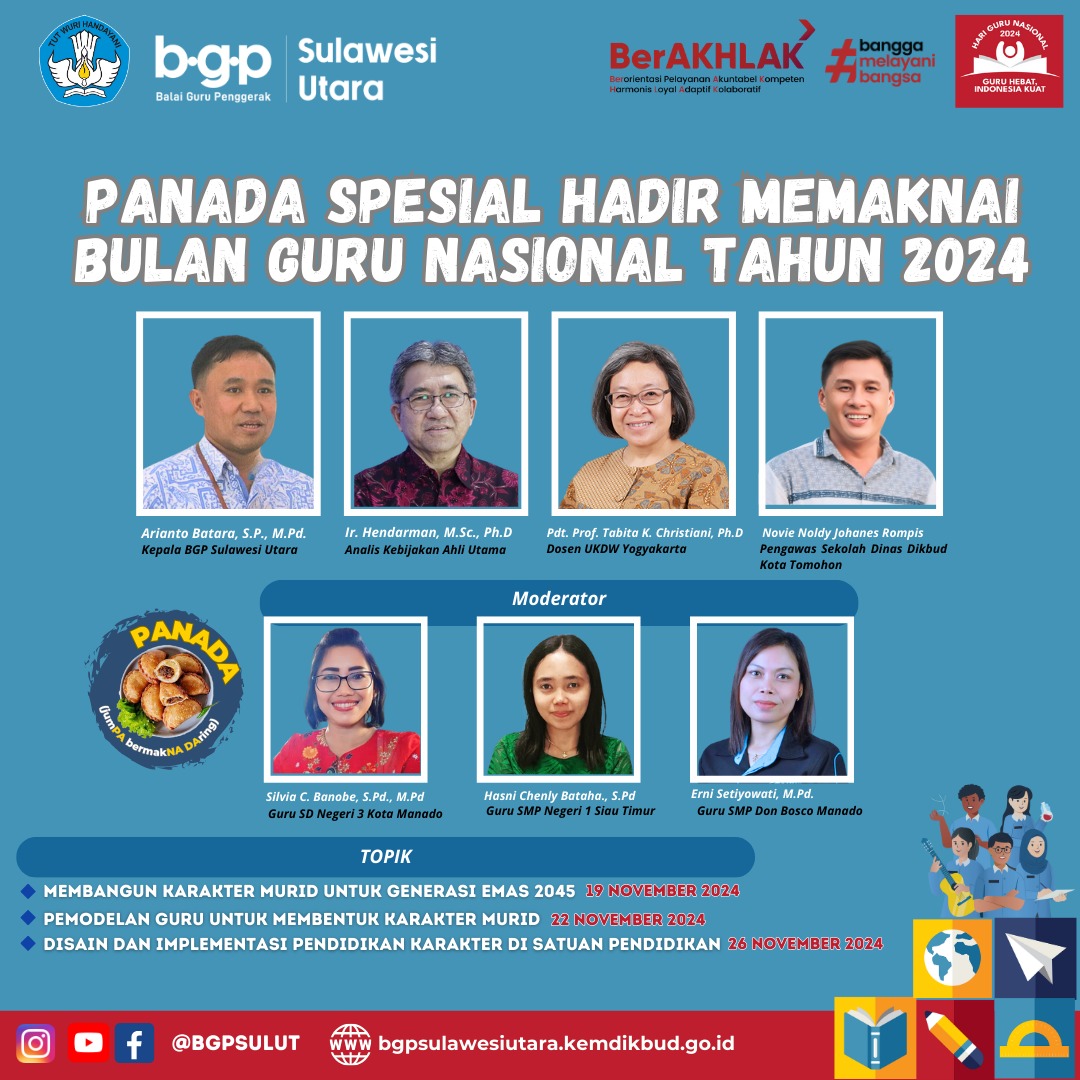 Memaknai Bulan Guru Nasional, BGP Provinsi Sulawesi Utara menggelar Webinar JumPA bermakNA DAring (Panada) spesial HGN. Topik Panada Spesial adalah “Penguatan Pendidikan Karakter” yang merupakan salah satu Program Prioritas Kemdikdasmen.