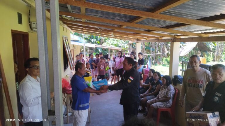 Merdeka17.id – Panji Yosua Jemaat GMIM Pergamus Sea menyerahkan bantuan sembako ala kadarnya kepada pengungsi Gunung Ruang Tagulandang di Perumahan Malimbukan, Desa Sea Jaga 3, Kecamatan Pineleng, Kabupaten Minahasa.