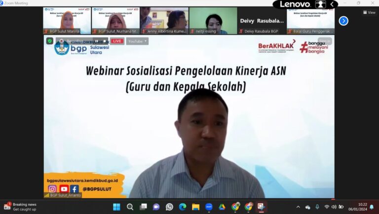 SOSIALISASI Pengelolaan Kinerja ASN (Guru dan Kepala Sekolah) melalui aplikasi Zoom dan channel Youtube BGP Provinsi Sulut pada Sabtu 06/01/2024 diikuti lebih dari 970 guru dan kepala sekolah. Kegiatan ini dilaksanakan oleh BGP Provinsi Sulut bekerjasama dengan Kantor Regional XI BKN yang wilayah kerjanya meliputi Provinsi Sulawesi Utara, Gorontalo, dan Maluku Utara.